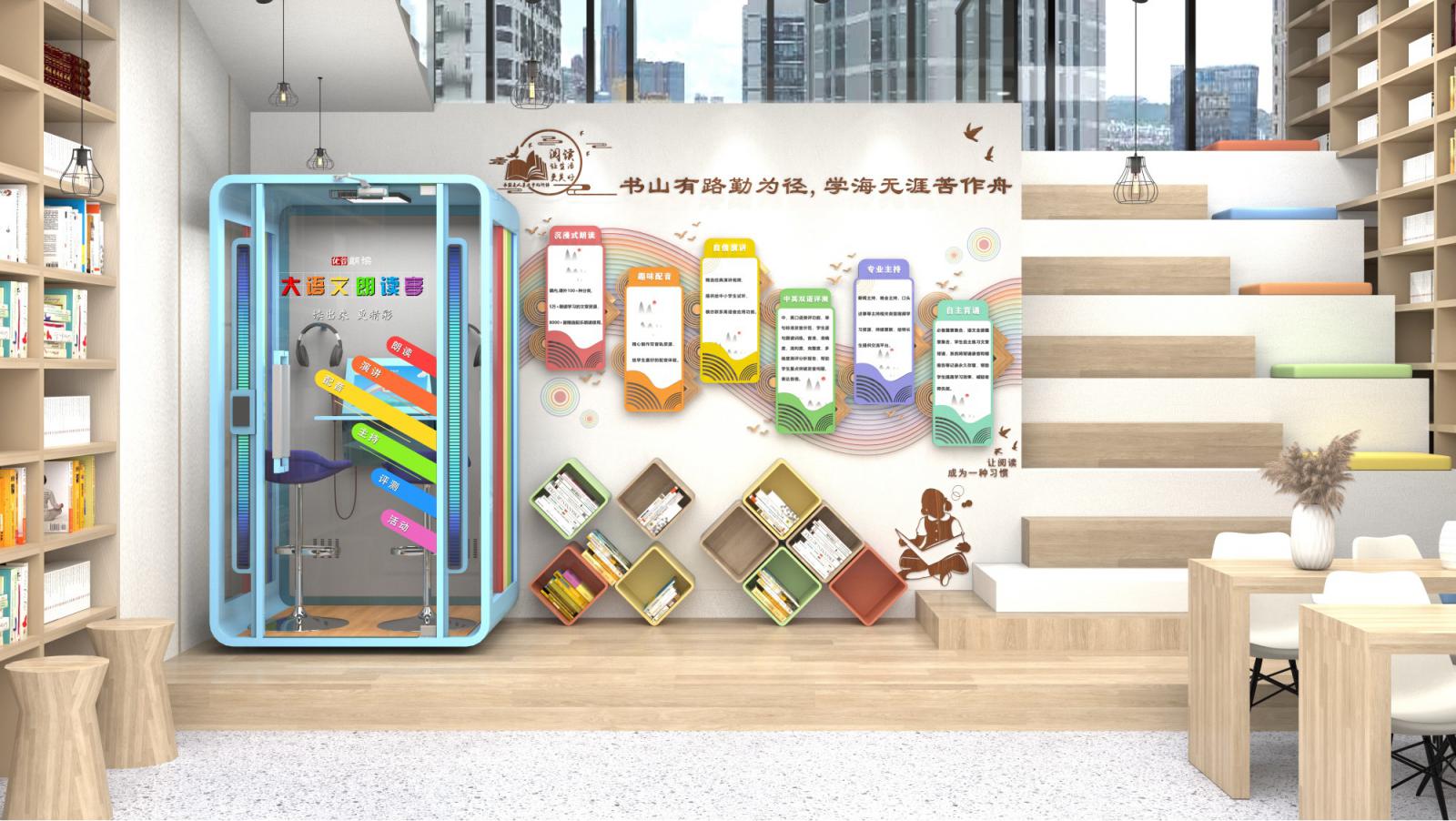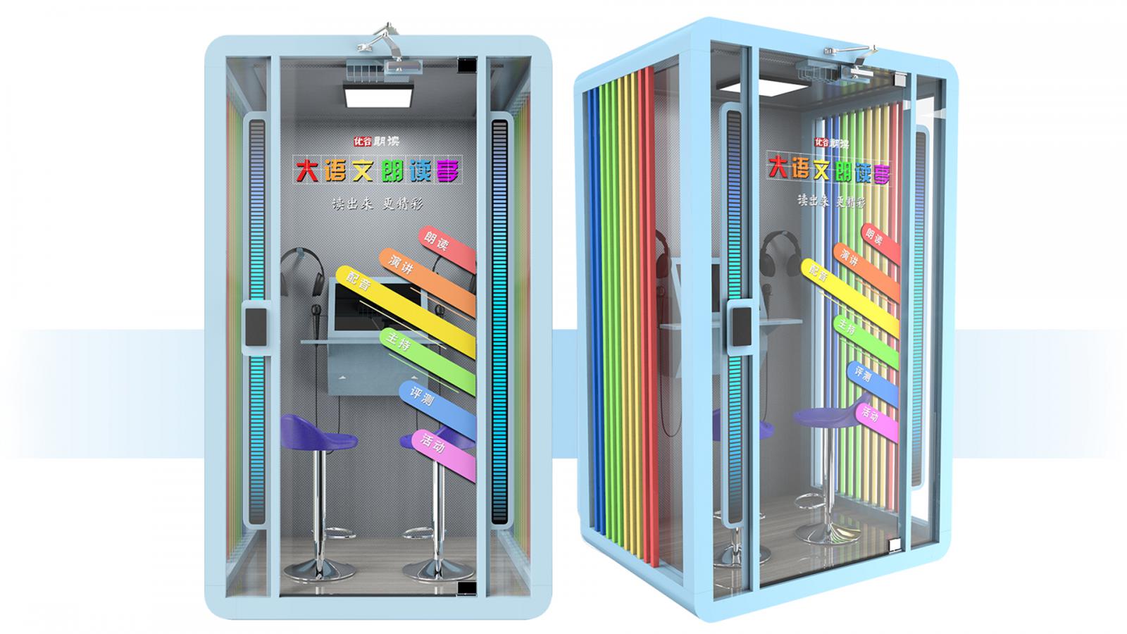 作为智慧朗读创导者、有声文化解决方案提供商,优谷朗读经过深耕、探索和总结,为中小学和幼儿教育量身设计,研发了一款适配于大语文教学的彩虹款朗读亭。